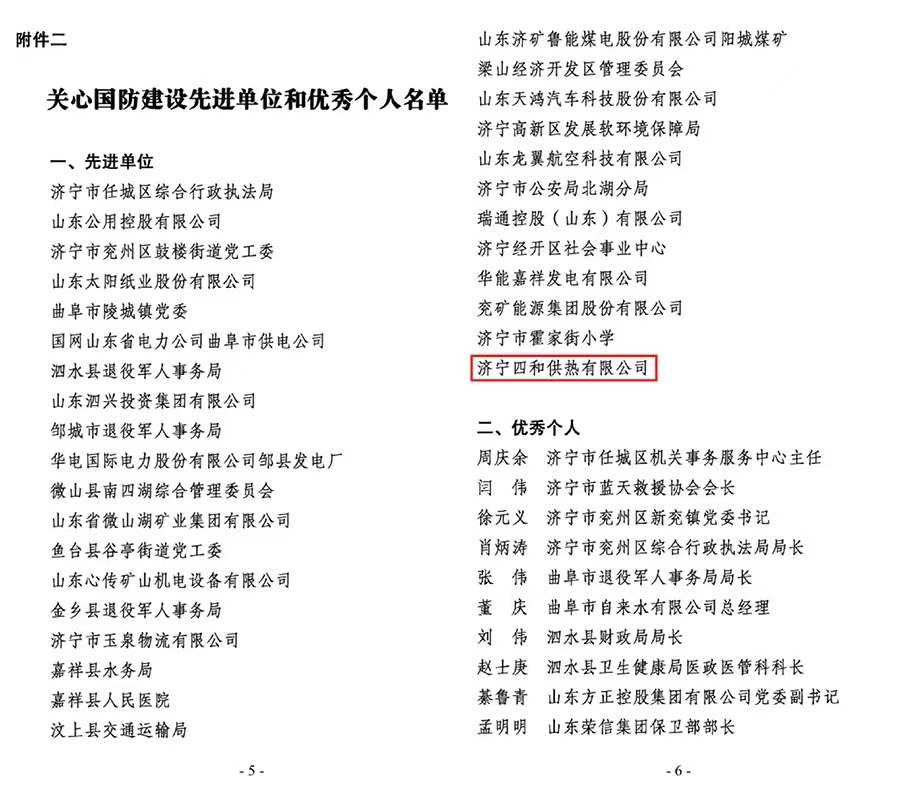 近日,中共濟(jì)寧市委辦公室下發(fā)了《關(guān)心國(guó)防建設(shè)先進(jìn)單位和優(yōu)秀個(gè)人名單》,濟(jì)寧四和供熱有限公司榮獲關(guān)心國(guó)防建設(shè)先進(jìn)單位榮譽(yù)稱號(hào)。